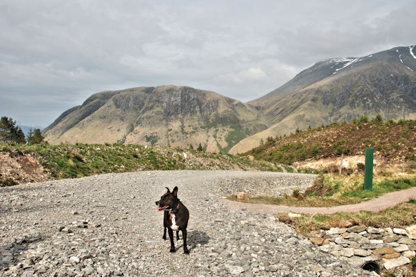Inveroran~ Kingshouse I was tired this morning, seeing as we walked 15 miles yesterday and didn't even wake Boss Woman until 7.10 a.m. for a pee, I was starving as well and ate loads of biscuits for my breakfast. It was raining last night and the paths are all muddy this morning. Boss Woman has a blister on her heel and Big Guy is limping. We had a nice 10 mile walk over Rannoch Moor which was really very nice and soft on my feet. We stopped for lunch at the top of the moor and we could hear the cuckoos calling really loudly. Further on, just before we got to Kinghouse we stopped on the top of the moor again for a rest ~ it was really nice and peaceful with lovely views over Glen Coe. I laid on my back and sunned my tummy and had a sleep. Then we had a short walk down to Kinghouse Hotel where we saw Luca and his Boss Woman Ann. Ann very kindly sponsored me £5 for the walk. We all went into the Climbers Bar for dinner and I got to share Boss Woman's and Big Guy's dinner with them. Everyone made a big fuss of me again, which I liked. There were deer outside the hotel but I didn't chase them because I was too tired. |