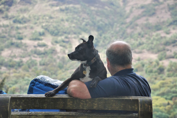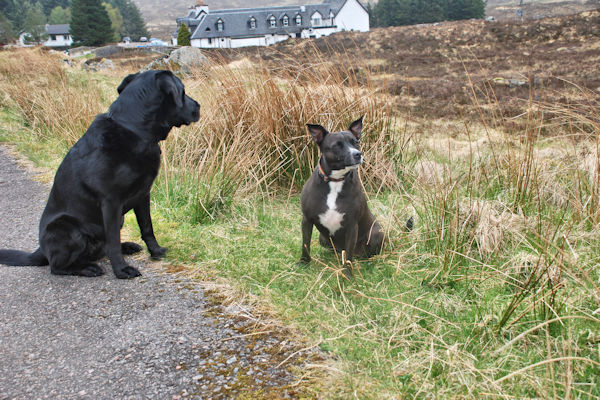 Ewich ~ Inveroran Really nice and warm today. We walked over the moors at the side of a river and then alongside the West Highland Railway. We saw some trains going past and some people waved to us. Boss Woman called in at the Green Welly Shop at Tyndrum and bought me a tin of sardines for my lunch. They were well tasty .. We passed a sign that said someone wanted to open a gold mine and then walked past a disused lead mine. Everywhere I look there are massive mountains on all sides. I am really tired today and don't even want to chase birds or play stick fighting I just want to walk and get there to my bed. At least the grass is cool and soft on my feet. We walked over West Highland Railway Iine at Bridge of Orchy and some people we had met on the walk in the guesthouse there waved to us, but we couldn't stay there because they didn't allow dogs. I was very hungry when we got to very expensive Inveroran Hotel and was glad to get my tin of meat for my tea. It was very nice there though and they made us all very welcome. I got to share Boss Woman's dinner in the bar as well. |