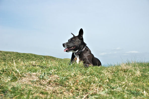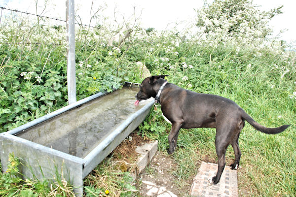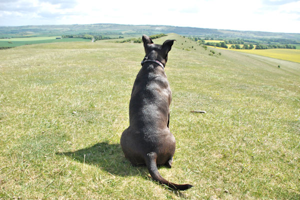 Wendover ~ Ivinghoe Beacon 11 milesNice and warm and sunny today. Caught the train back to Wendover this morning and continued the walk. On the way from the train station there was a squirrel on the path and it was in such a hurry to get away from me that it ran up a tree and fell off again, right in front of me on the path. Fortunately for the squirrel I was on lead so I wasn't able to chase it ... Next time .. The path here was very pleasant, through some woods and then walked on another leafy ancient sunken path. The path was nice and soft of my feet, which made a change after the hard flint path we had previously been walking on and the woods had plenty of nice interesting things to smell. We walked through a field of nosey cows that looked like they were going to come and say hello. I was carrying a stick in my mouth and couldn't be bothered chasing them so Big Guy let me stay off lead. The guy called Andy caught us up again and walked with us for a while. Walked across the A41 bridge, round the back of Tring Station and back on the grassy path. Bit of a climb up towards Beacon Hill and there were some guys taking advantage of the windy exposure on the hill by flying model gliders. In fact one crashed so I think the guy needs a more practise! I sat on the top of the Trig Point for a photo. It was really windy and nearly blew my ears off. Just another little bit to walk on then we got to the end BEACON HILL and the end of the walk. From Beacon Hill we could see a white chalk lion cut into the Hillside. On all of the walk, we have seen a few white horses cut into the chalky hillside, which Boss Woman found interesting but I didn't think they were .. just a white blob thing on the grass as far as I am concerned. |