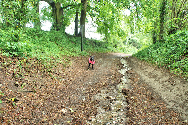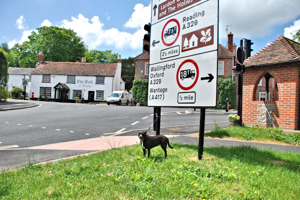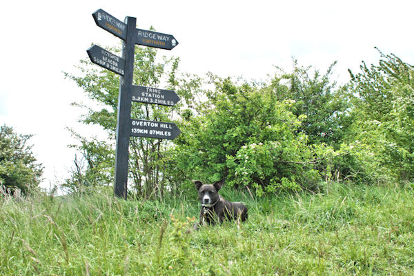 Chinnor ~ Wendover 13 miles Walked through Wainhill to join the Ridgeway again then through some woods. There was some black bullocks in the fields where the path went and seeing Boss Woman is scared of cows, we had to detour into another field so we didn't walk past them. I could have scared them away but Big Guy kept me on lead The path went around the back of Princes Risborough but it was not very nice here as it was busier with a lot more cars and people. We met someone with a Jack Russell puppy and the woman picked it up in case I attacked it. Sigh .... as if. Boss Woman told her that I certainly would NOT attack it and that I liked all dogs, so she put it down on the floor and I had a sniffy with it. The woman looked quite relieved when I didn't eat it. Ha Ha. Went past a pub in Casden where someone called David Cameron goes for a pint. Further on, someone had snapped the Ridgeway sign off and their garden hose was spraying over the path, I think someone was trying to tell us that they didn't like the path going past their house. It started raining so I had to wear my raincoat. Some guy called Andy caught us up and was walking with us for a while. He made a fuss of me and told us that his wife couldn't finish the walk because she had very sore feet, then we limbed up a small hill to Combe HIll and down into Wendover. We had to catch the train from Wendover to Great Missenden to stay the night because NOWHERE in Wendover would let ME stay. Seemingly no one in Wendover likes dogs ... ah well, their loss ... they missed out on my licky kisses, serves them right. Stayed at a really nice place called the George Inn in Great Missenden. Everyone liked me there and made me very welcome and a really nice woman brought me loads of gammon scraps for my tea. Big Guy and Boss Woman had their tea and a beer in the pub. Only trouble was, I was tired and wanted to sleep but everyone kept wanting to make a fuss of me all the time and stroking me and talking to me. Yawwwnn. Thursday