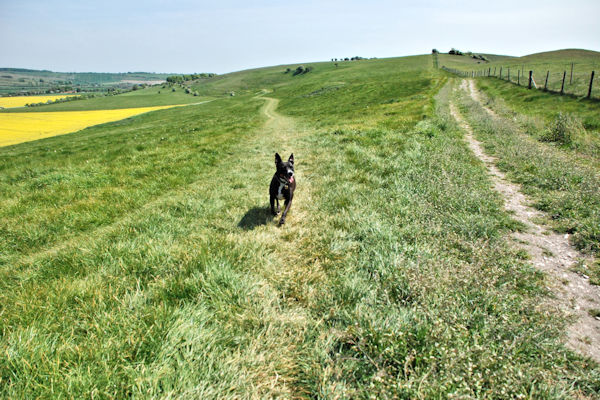 Avebury ~ Ogbourne St. George 9.5 miles Stayed at Brown's Farm, Marlborough last night. The very nice lady there dropped us off at the start of the walk at Avebury Hill. Met Cara Staffie and her nice owner and then walked on the easy Ridgeway path over to Ogbourne St. George. Unfortunately on the way down to Ogbourne St. George there was some cows in the field right next to the path. Ooooh Boss Woman was so scared. Luckily the cows didn't chase us and we arrived at Lavender House B & B without getting gored to death. Saturday 7th May
